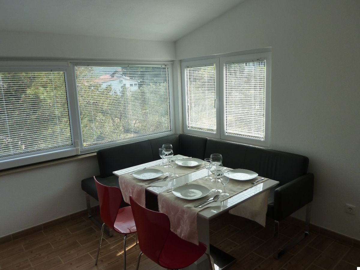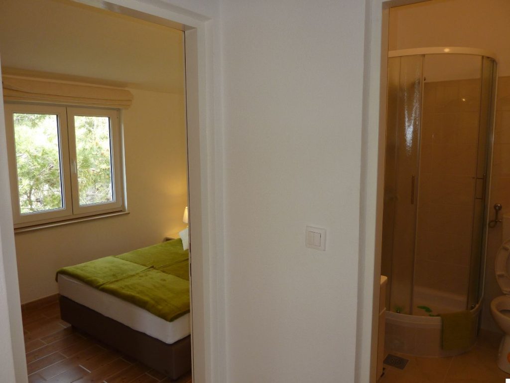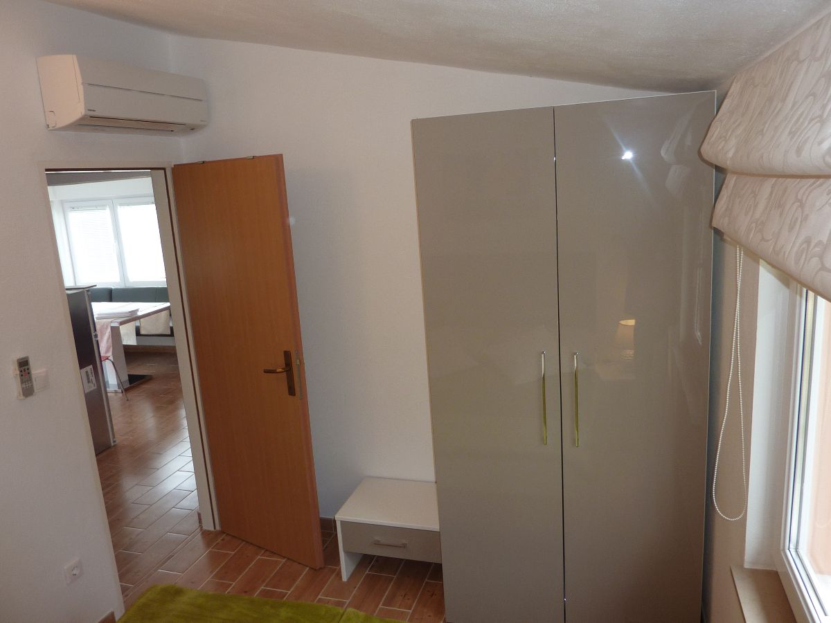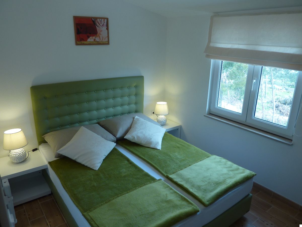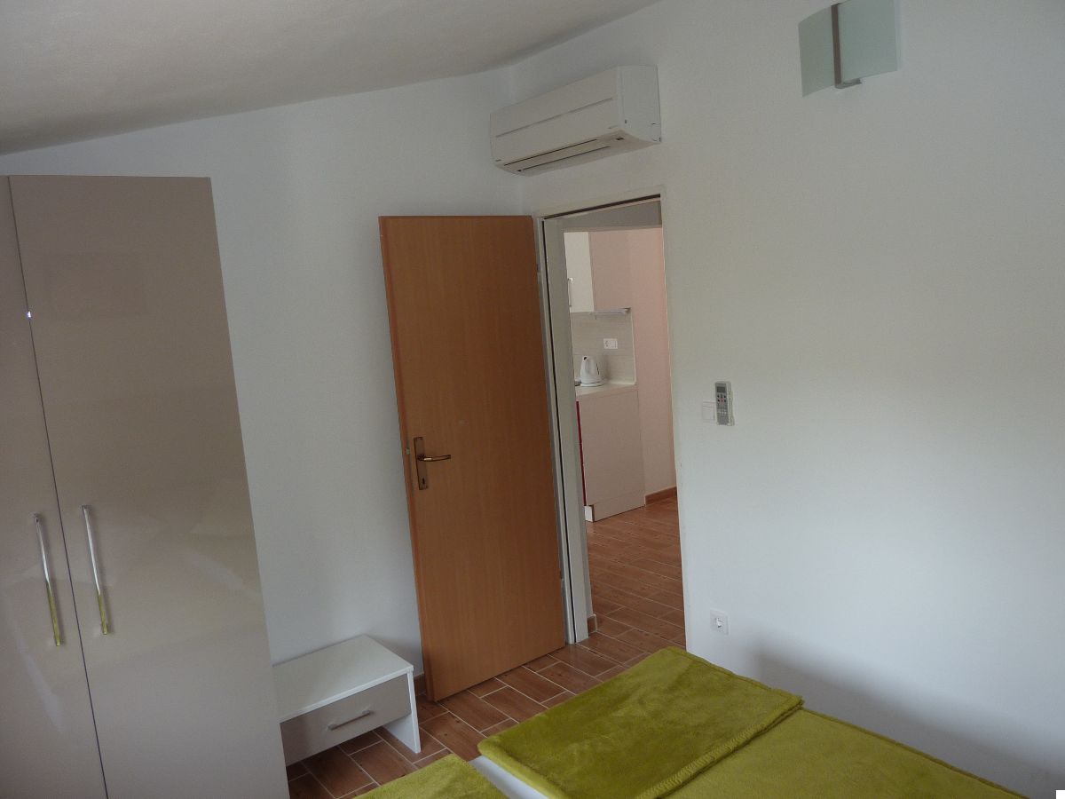 Accommodate 4 persons. Two bedrooms, bathroom. Kitchen equipped with all utensils and appliances. Living room is turned into the lounge by opening of the large sliding door. Sea view to the north and old olive-growth to the south. All rooms fully air-conditioned. Parking available.
